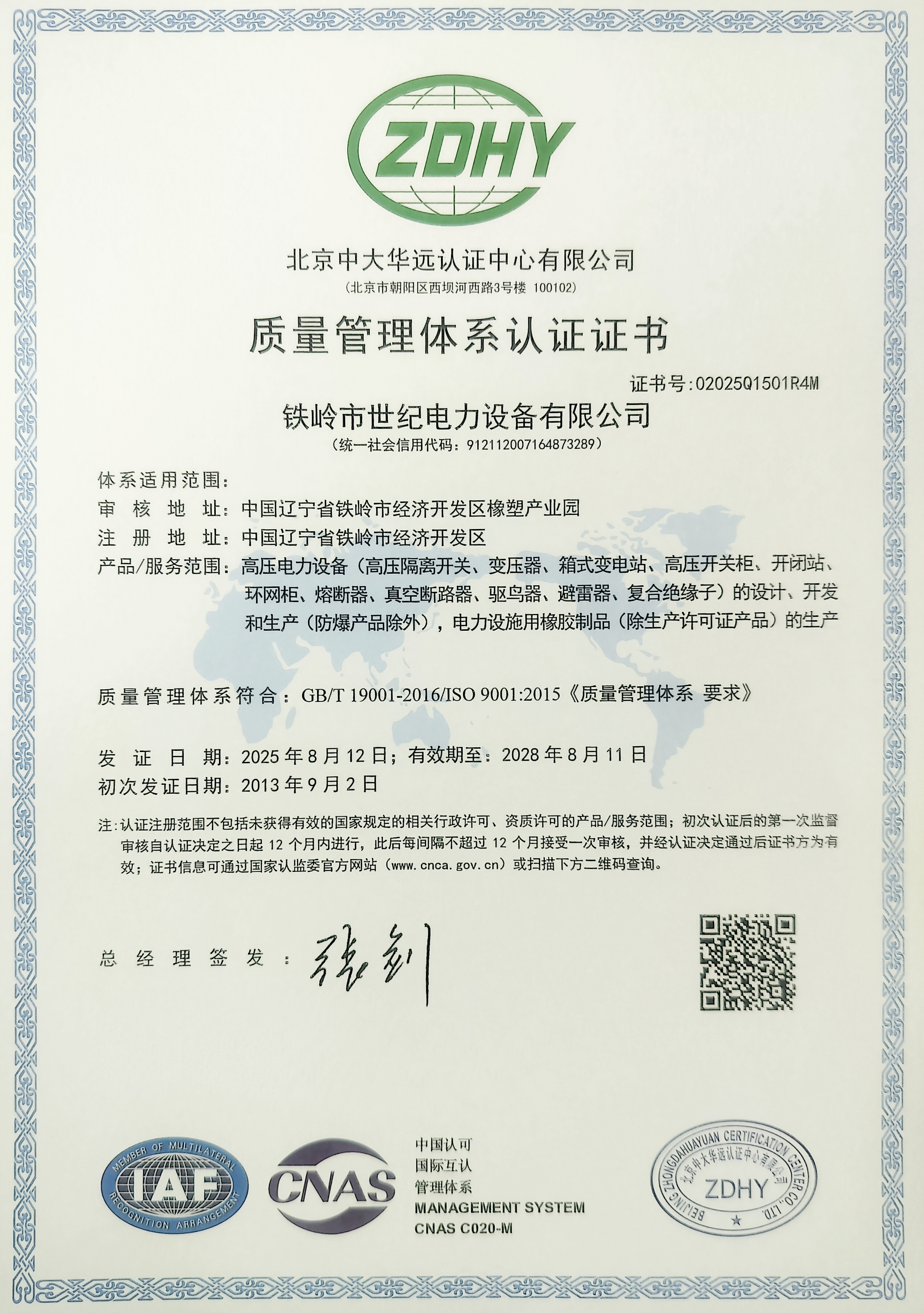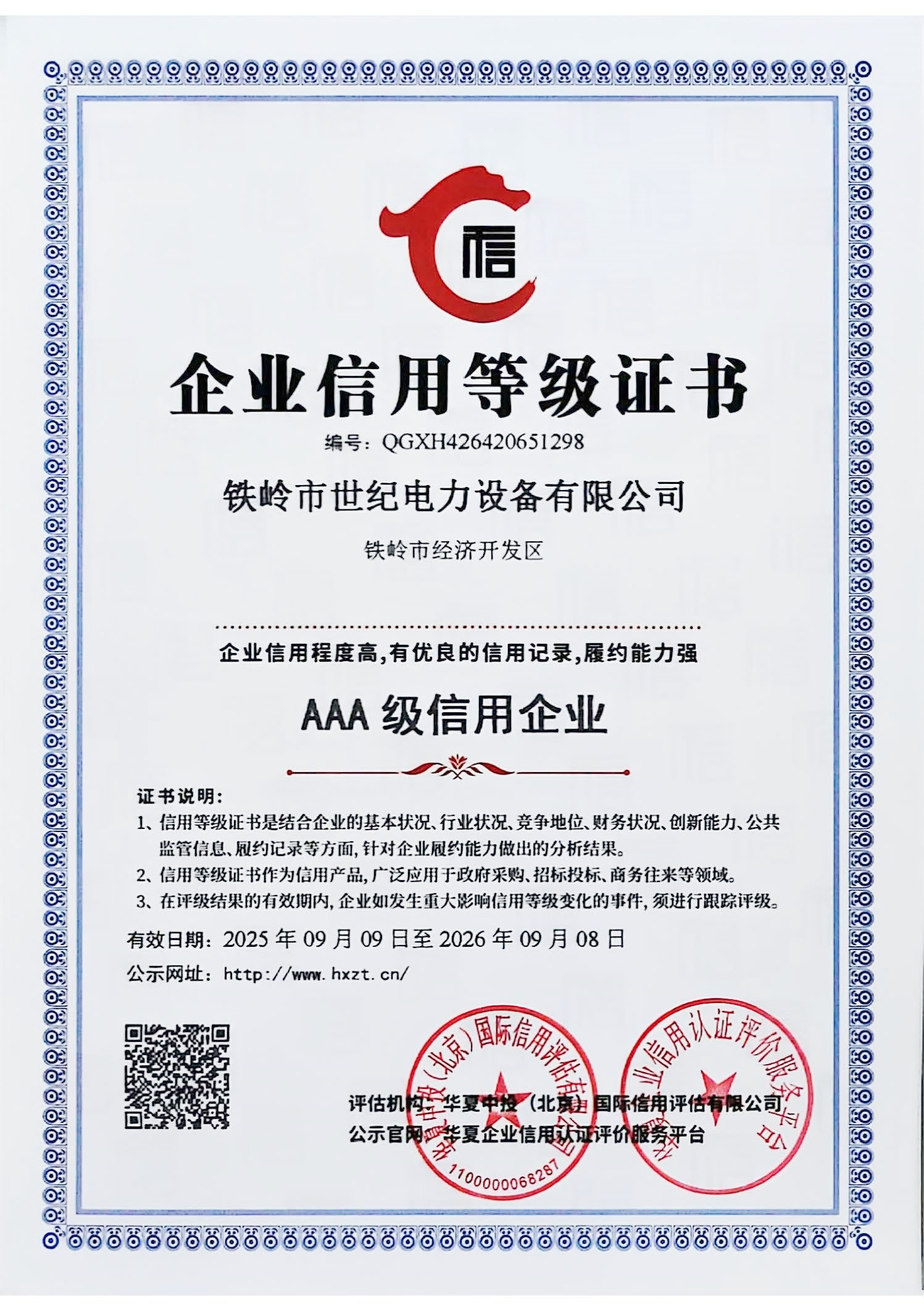 鐵嶺市世紀電力設(shè)備有限公司是集科研開發(fā)、生產(chǎn)制造、用戶服務(wù)于一體的國家高新技術(shù)企業(yè),始建于1999年,位于鐵嶺經(jīng)濟開發(fā)區(qū),占地面積5萬余平方米,建筑面積2萬余平方米。主要從事國家電網(wǎng)配套戶外高低壓隔離開關(guān)、電力電纜、變壓器成套裝置、高低壓開關(guān)柜、箱式變電站、絕緣子等產(chǎn)品的研發(fā)、生產(chǎn)和銷售。公司現(xiàn)有國家發(fā)明專利6項、實用新型專利9項,公司通過了ISO9001國際質(zhì)量管理體系認證、ISO14001環(huán)境管理體系認證和ISO 45001職業(yè)健康安全體系認證。